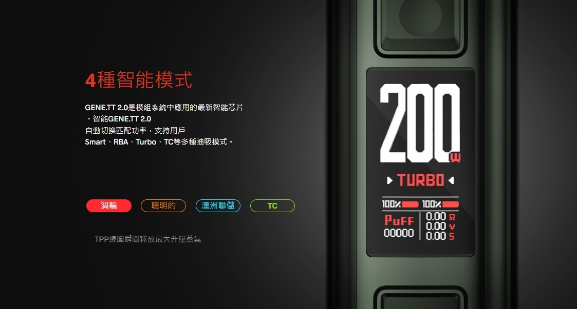 ARGUS GT II 支援最高 200W 的功率輸出,讓使用者可以根據自己的 vaping 風格進行精確調整,實現個性化的吸煙體驗。 - GENE.TT 晶片技術